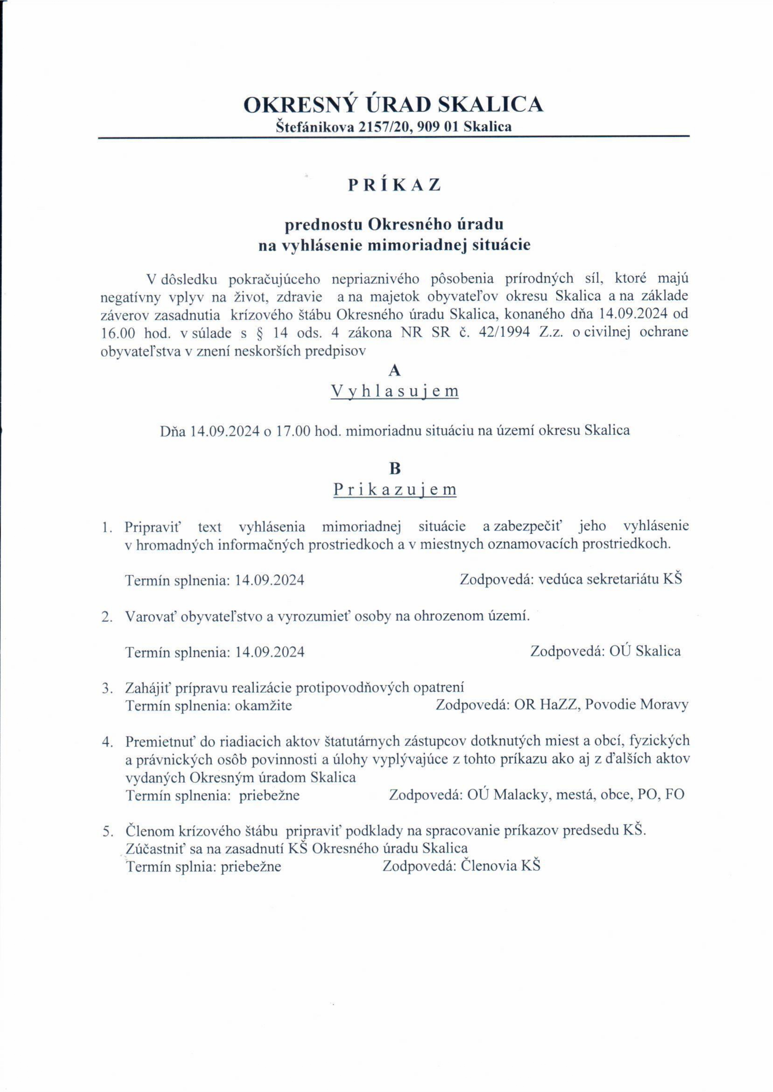 Vyhlásenie mimoriadnej situácie na celom území okresu Skalica