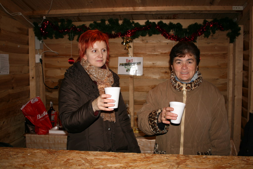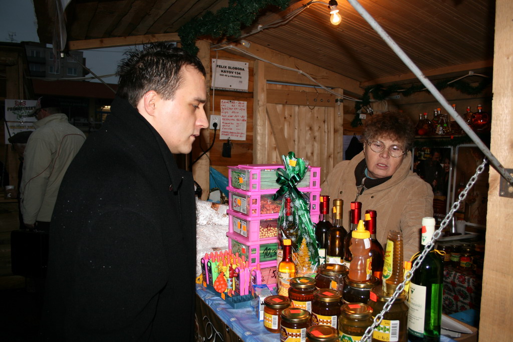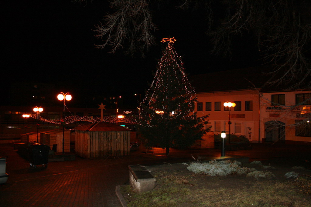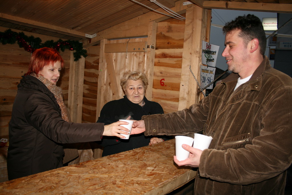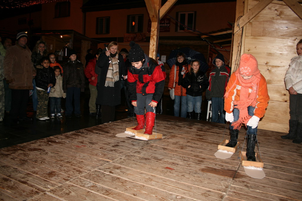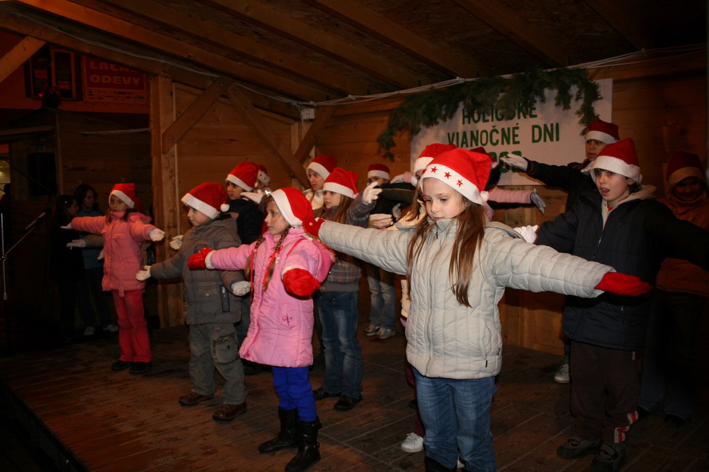Predvianočný týždeň v tzv.adventnej dedinke z drevených stánkov na Námestí mieru s podvečernými vystúpeniami detí materských a základných škôl. December.