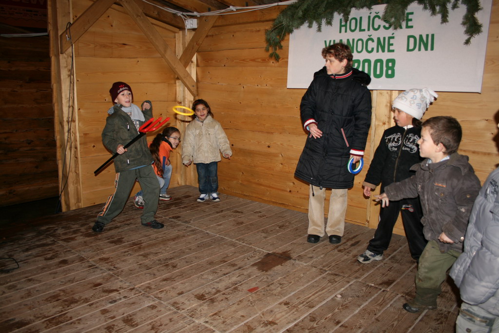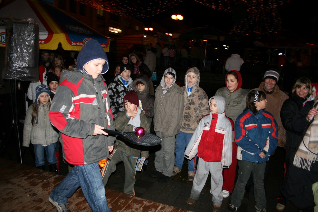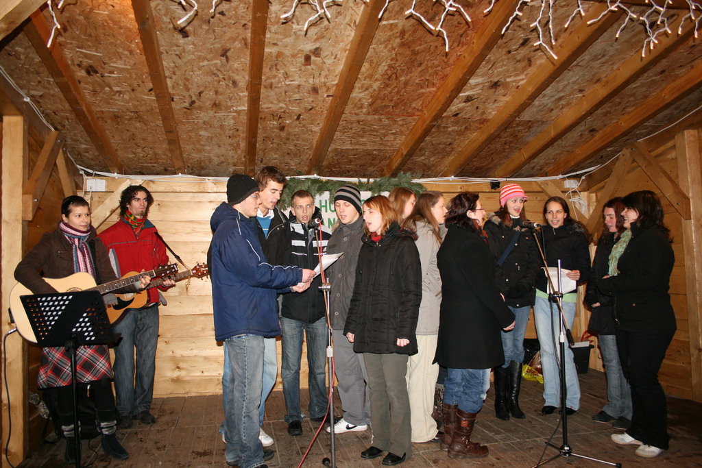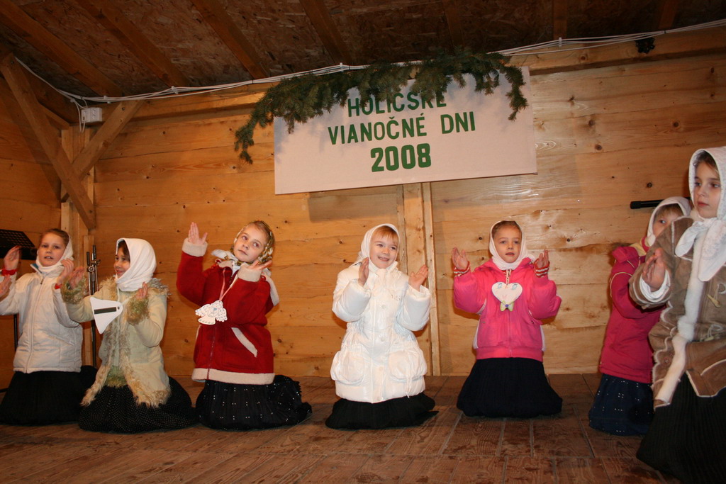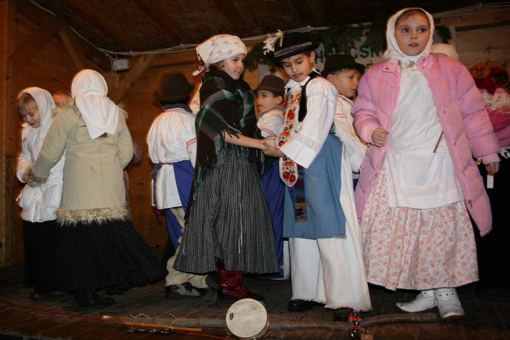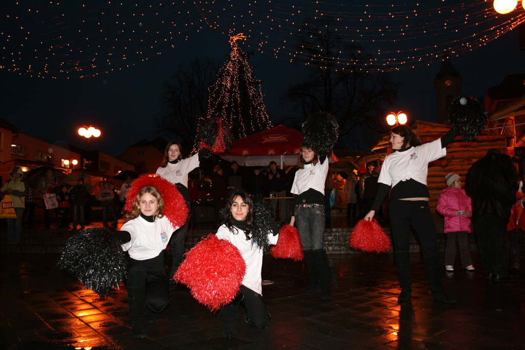 Predvianočný týždeň v tzv.adventnej dedinke z drevených stánkov na Námestí mieru s podvečernými vystúpeniami detí materských a základných škôl. December.