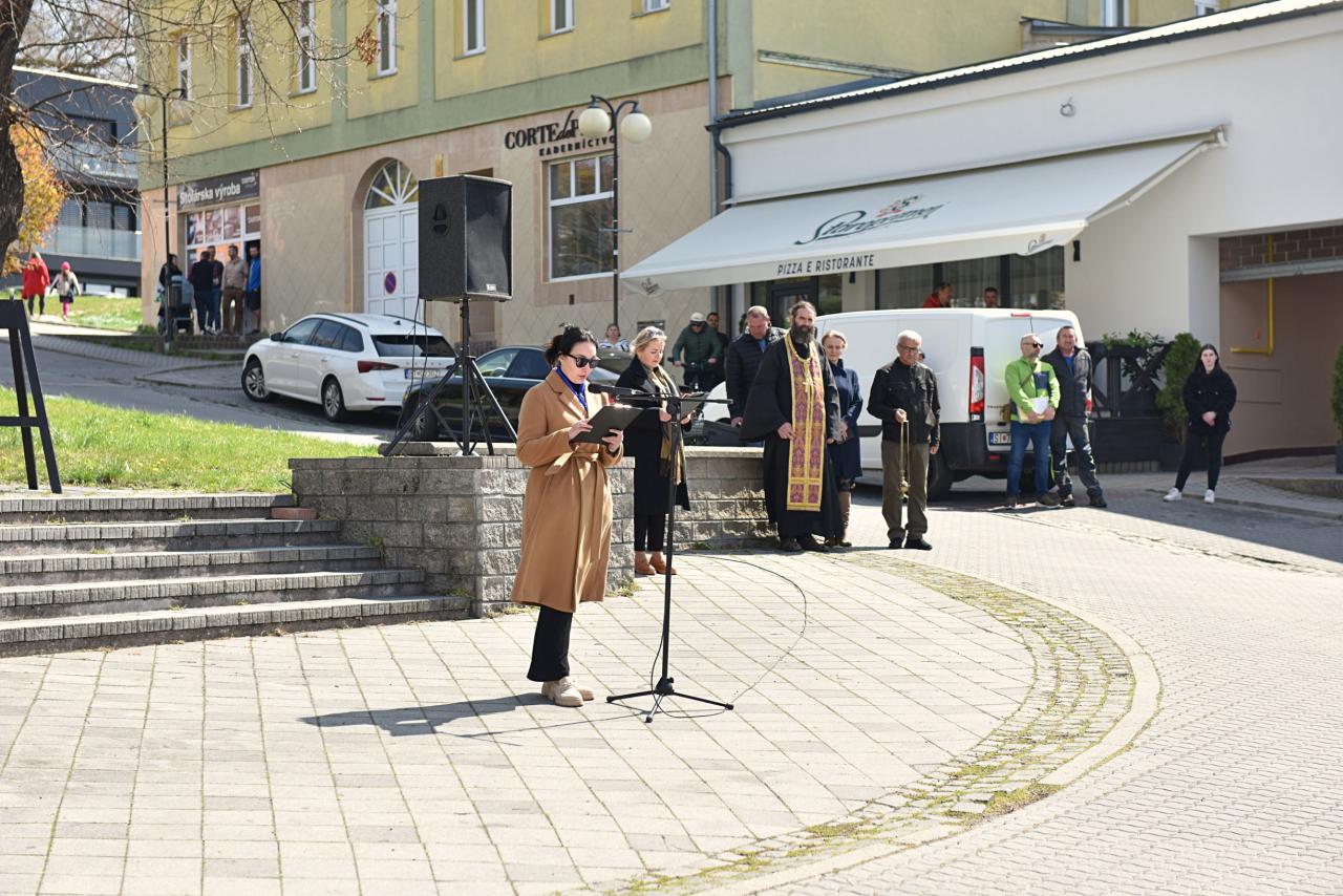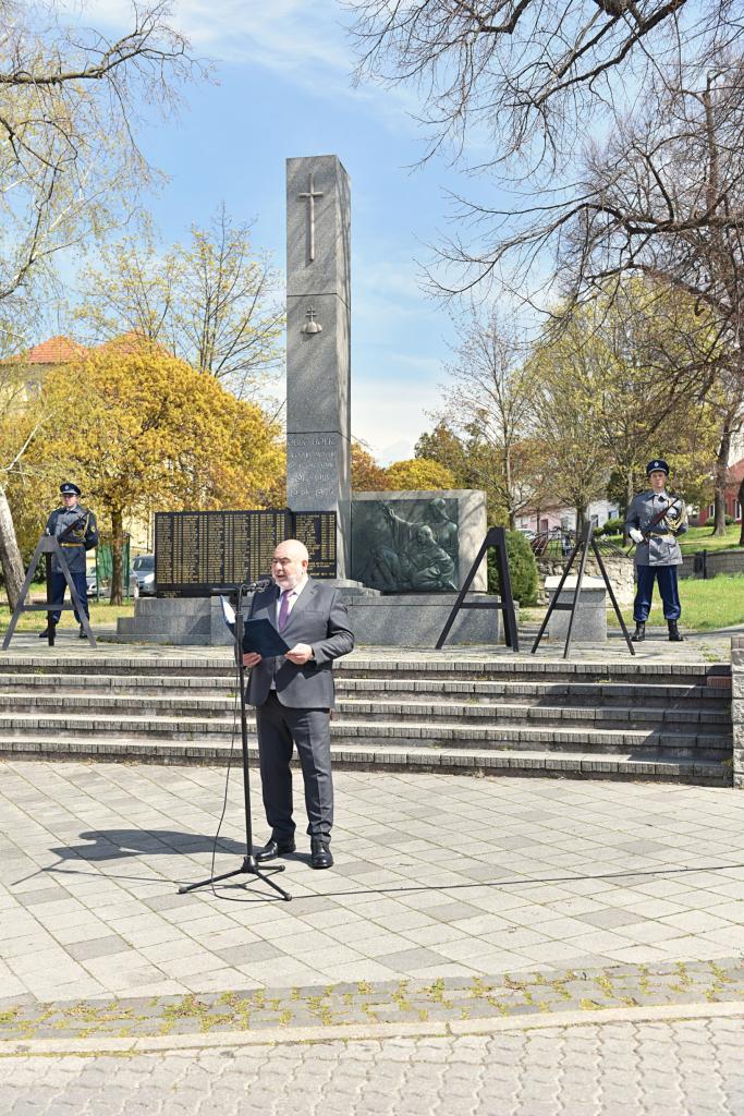 na poctu padlým v I. svetovej vojne. K ich menám vyrytým na žulové dosky pribudla v roku 1946 tabuľka s menami 36 vojakov, ktorí položili svoje životy pri oslobodzovaní nášho mesta v II. svetovej vojne. Počas slávnostného odhalenia pomníka zaznela hymnická pieseň Kto za pravdu horí a tá symbolicky zaznela i počas pietneho aktu, aby zvýraznila mimoriadny význam týchto dejinných udalostí.