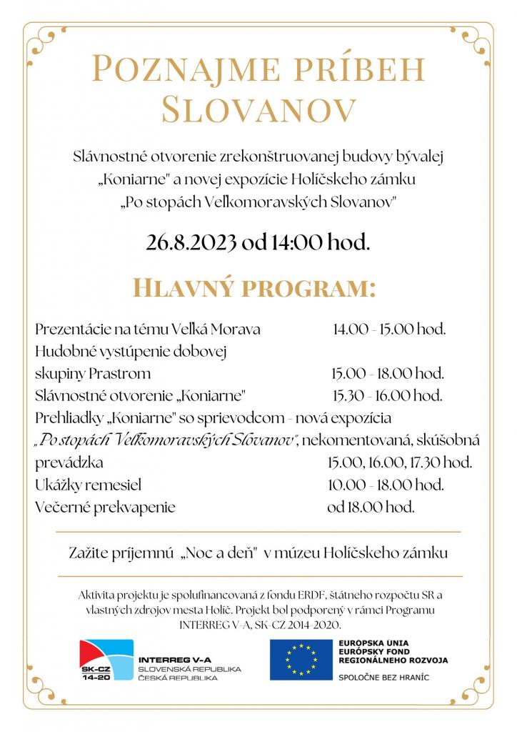 Prezentácia na tému Veľká Morava 14.00 - 15.00, Hudobné vystúpenie dobovej skupiny Prastrom 15.00 - 18.00, Slávnostné otvorenie "Koniarne" 15.30 - 16.00, Prehliadky "Koniarne" so sprievodcom - nová expozícia "Po stopách Veľkomoravských Slovanov", nekomentovaná, skúšobná prevádzka 15.00, 16.00, 17.30, Ukážky remesiel 10.00 - 18.00, Večerné prekvapenie od 18.00